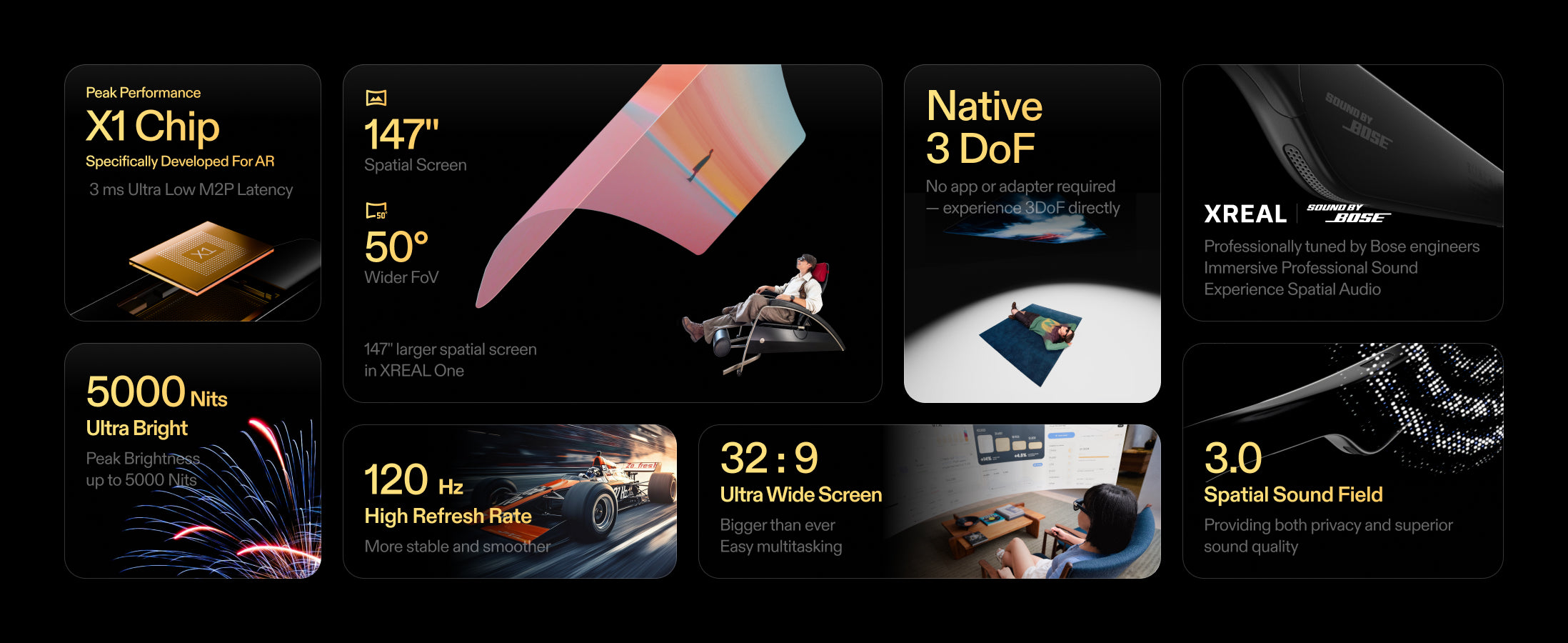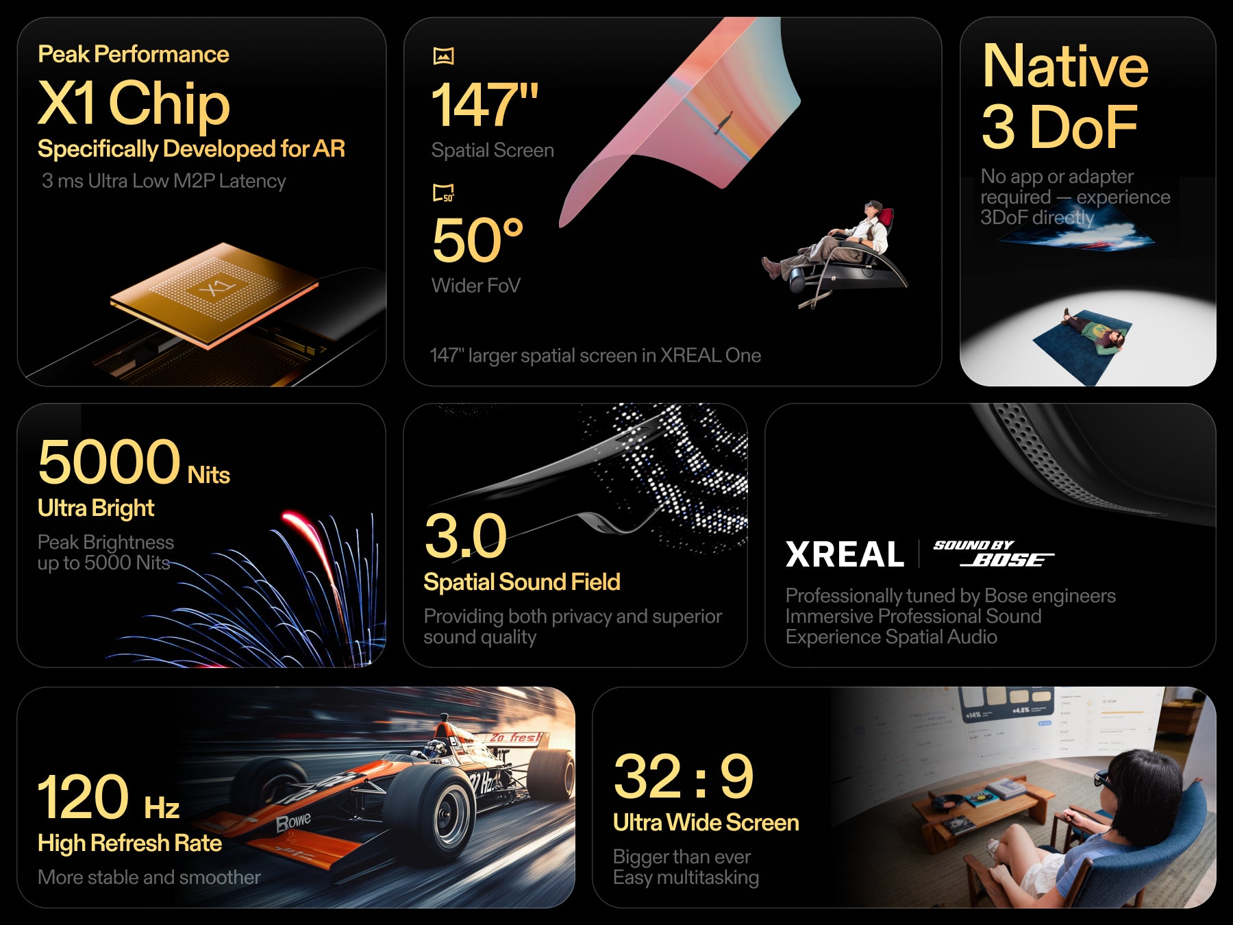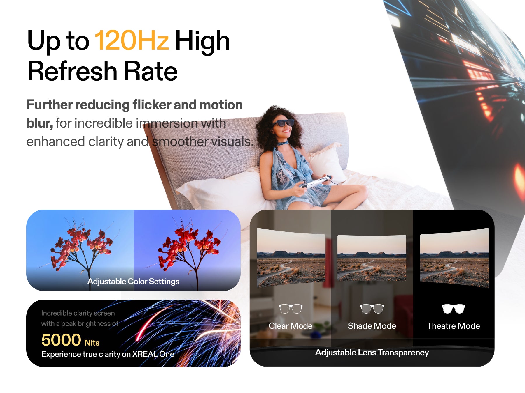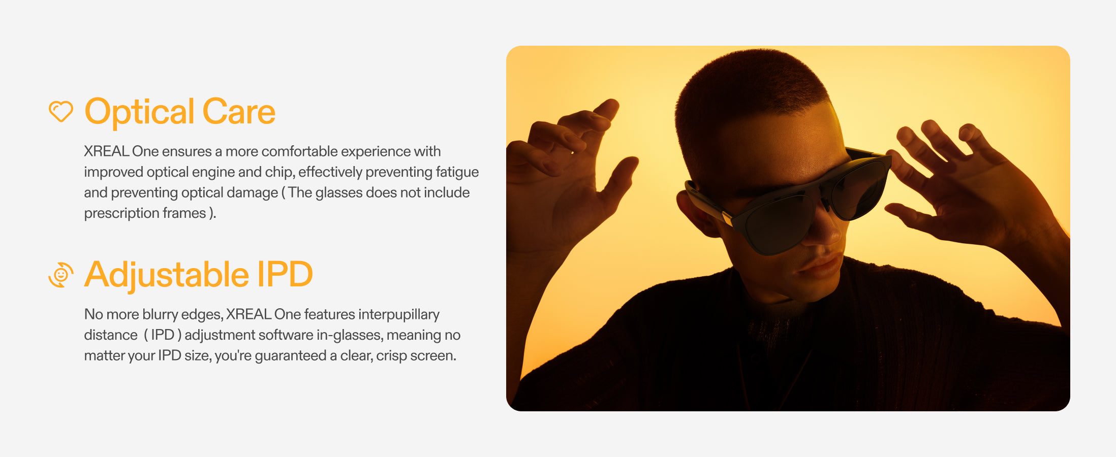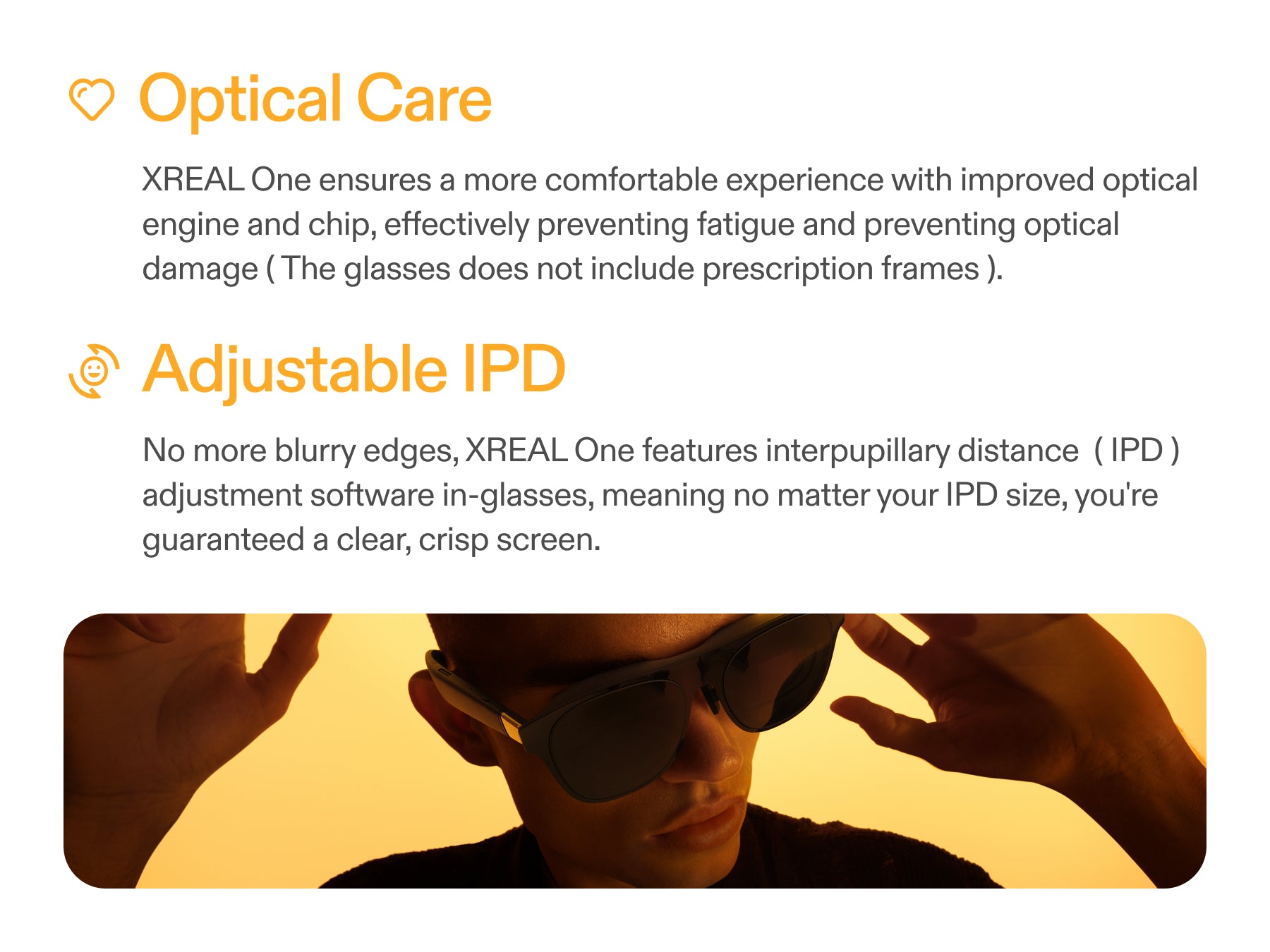 Both XREAL One and XREAL One Pro are advanced, AR devices with a built-in chipset that has revolutionized spatial displays. Compared to the XREAL One, the XREAL One Pro has a larger FOV (field of view), with a marginally brighter virtual screen, both of which enhance the visual experience.XREAL One Pro features an new and improved display system that significantly reduces outside light interference during use and reduces the image reflection sometimes seen on the front of the glasses, protecting user privacy.Additionally, XREAL One Pro features thinner and more lightweight front frame, giving it an inconpicuous appearance.XREAL One Pro offers multiple interpupillary distance (IPD) options to accommodate users with different IPD needs.